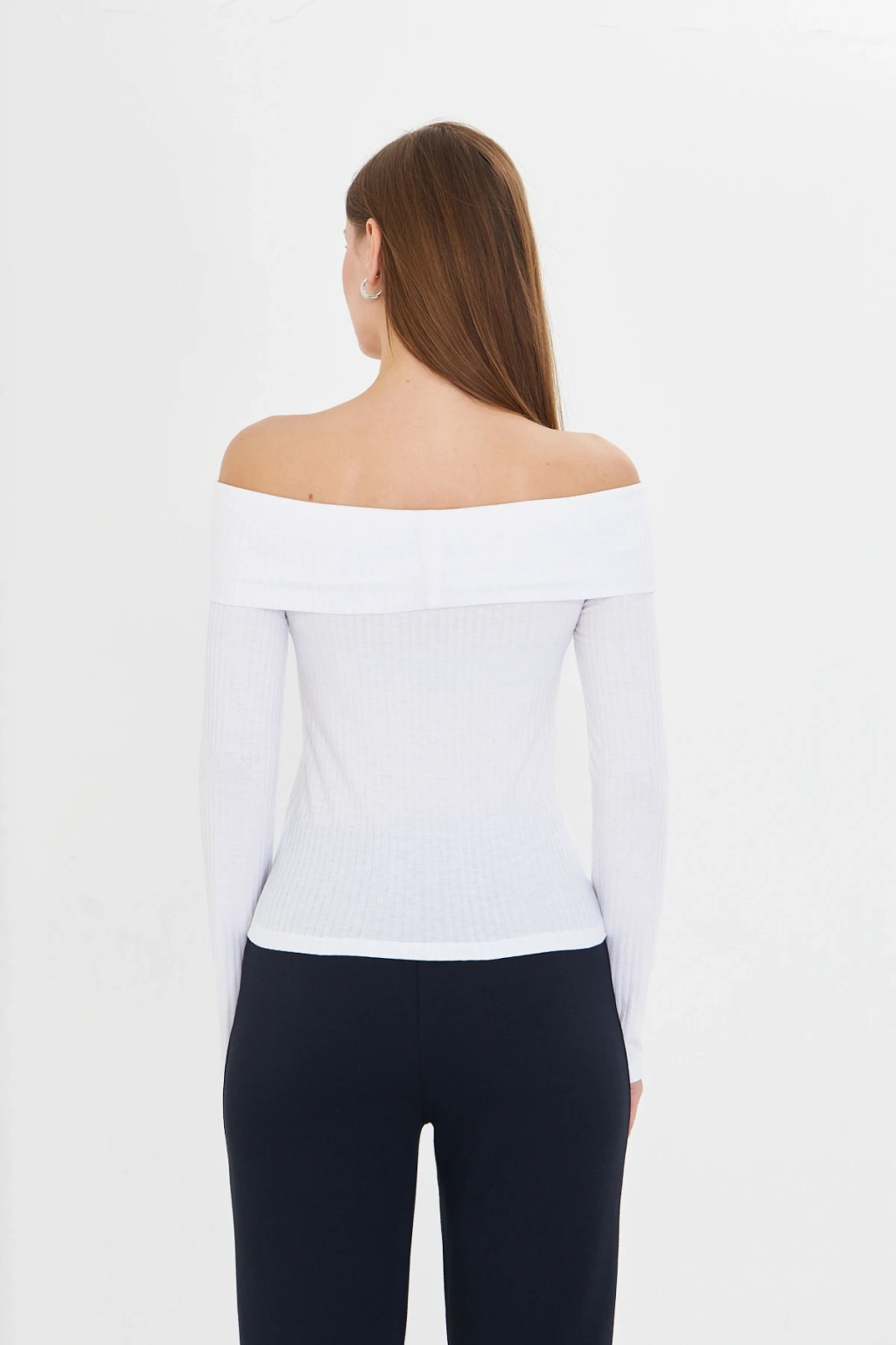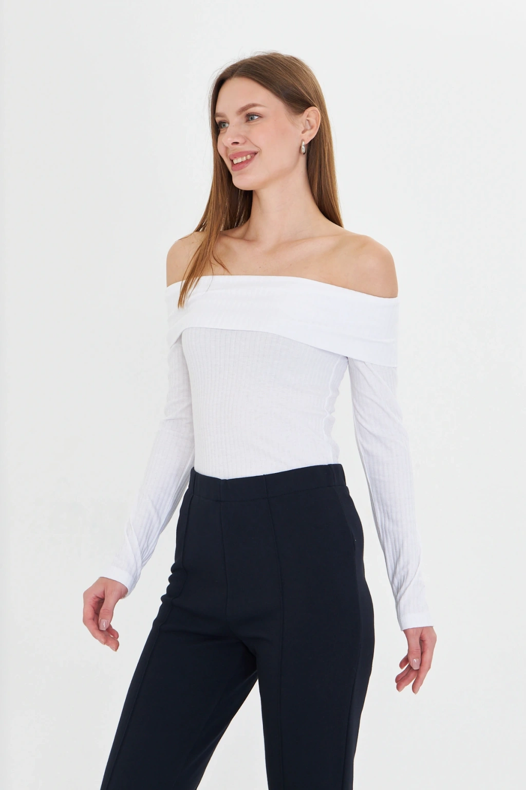 Özellikler: düz yaka, omuzu açık tasarım, uzun kol, vücuda oturan kesim, %95 Viskon %5 Elastan.